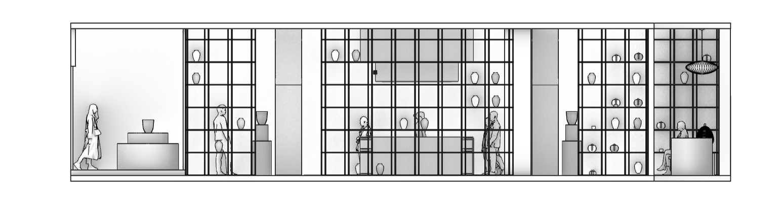 The shop window incorporates the point-of-sale displays, symmetrically positioned on both sides to create a central, open pathway that invites entry. This axis leads directly to the checkout, which is placed at the heart of the store. From the outside, the storefront is designed to spark curiosity - offering glimpses that draw passersby inward, guiding them naturally toward the center to discover the new product collection.